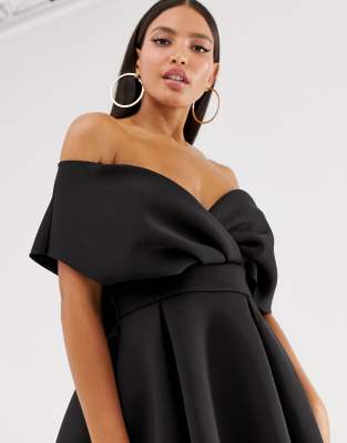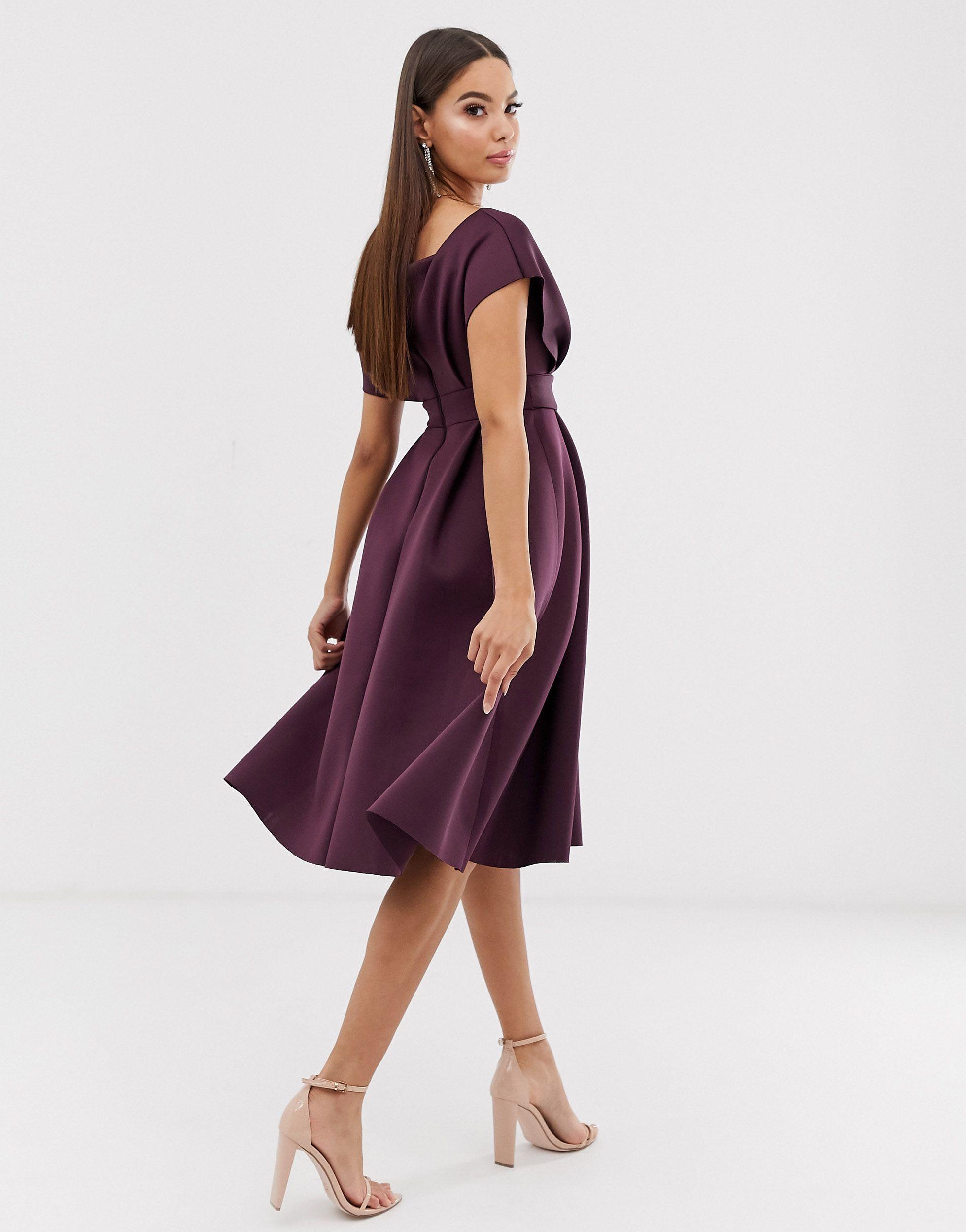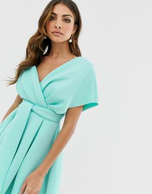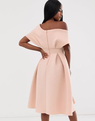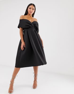 asos fallen shoulder midi prom dress with tie detail