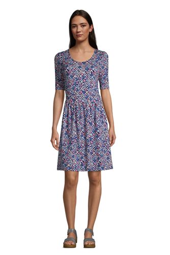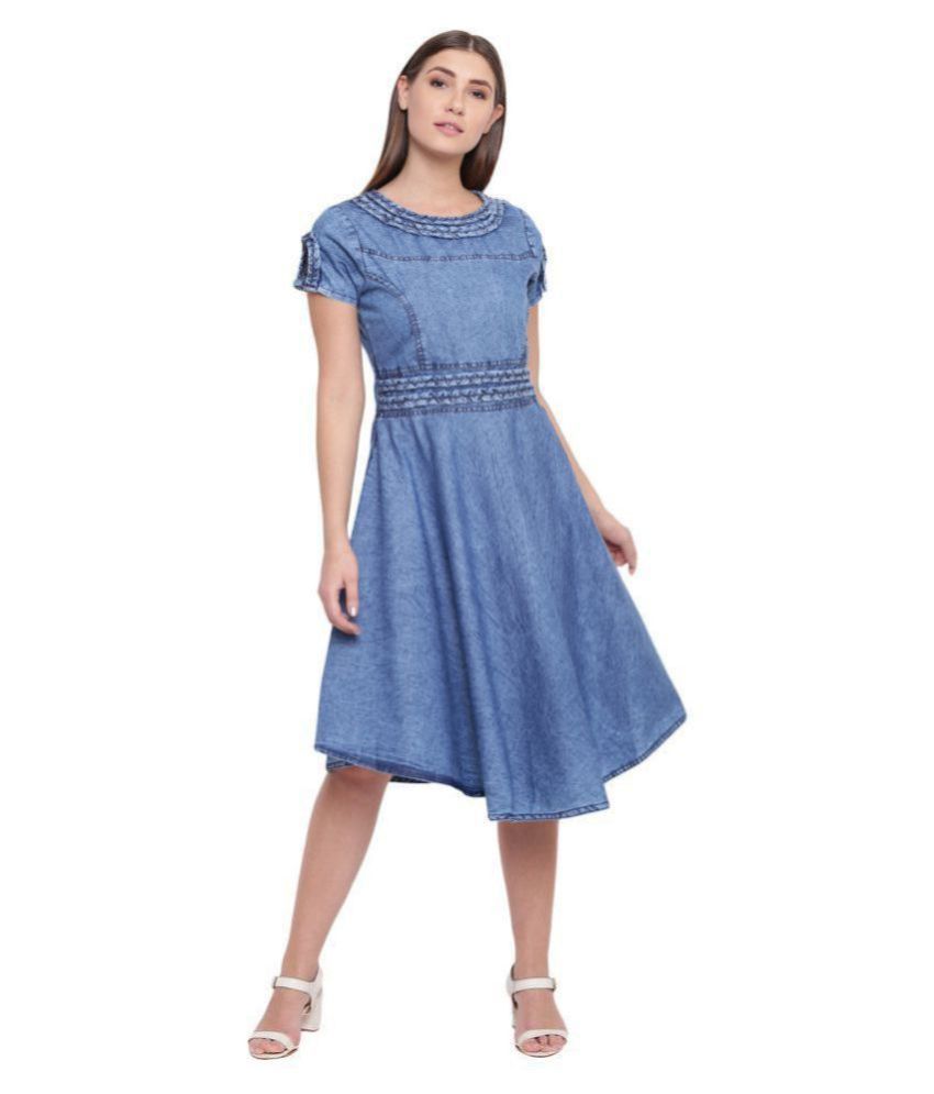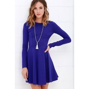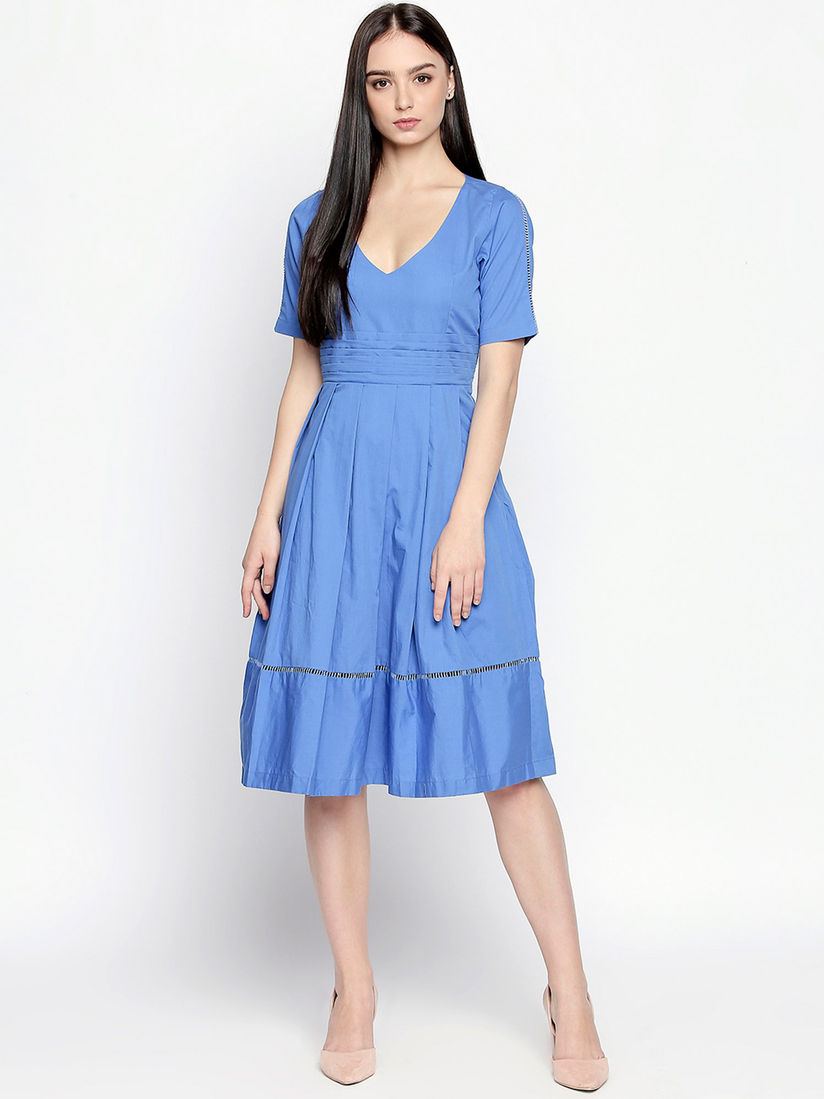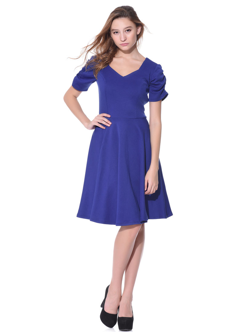 blue fit and flare dress with sleeves