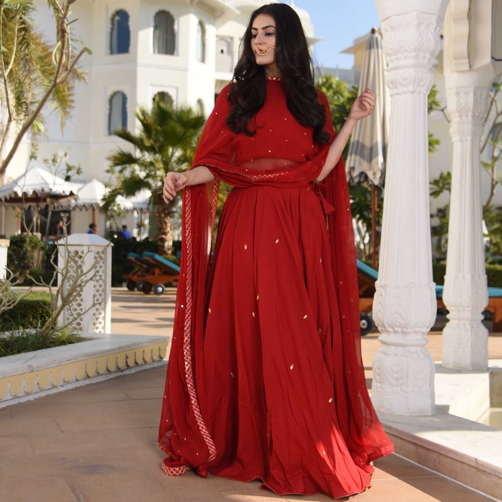 bunaai red lehenga