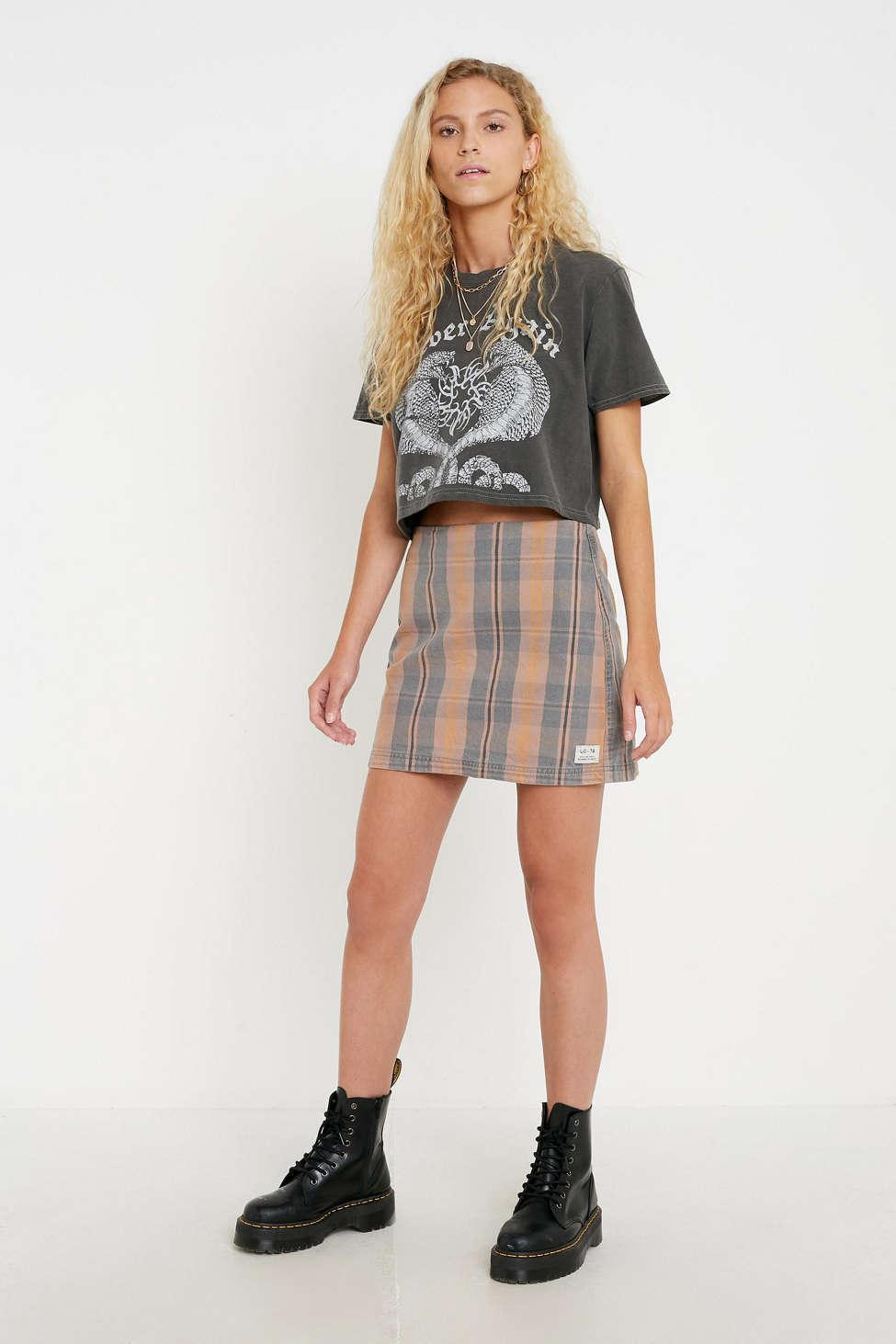 checked denim skirt