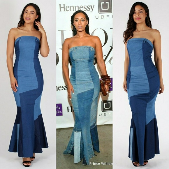 denim strapless maxi dresses
