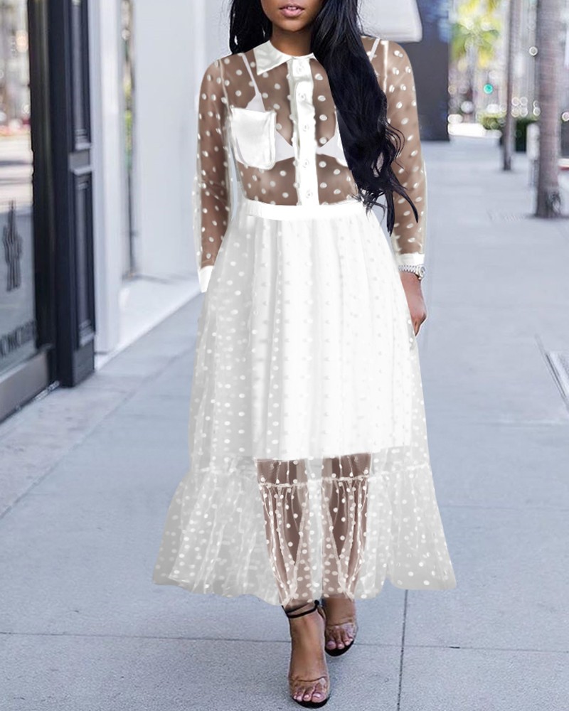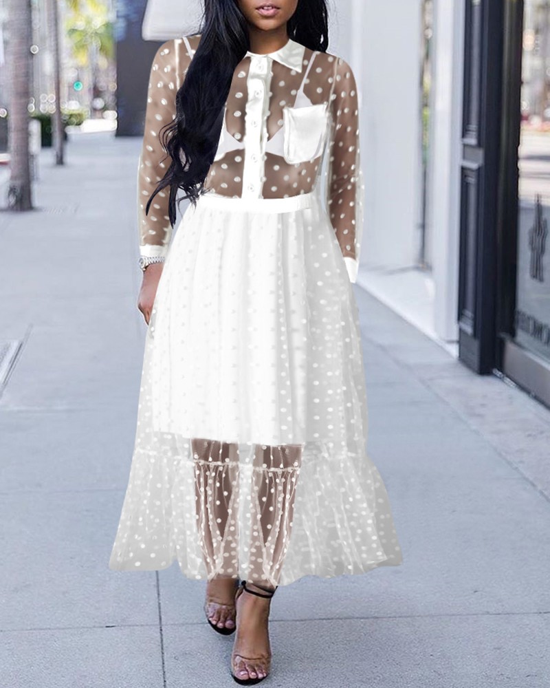 long sleeve dots sheer mesh dress