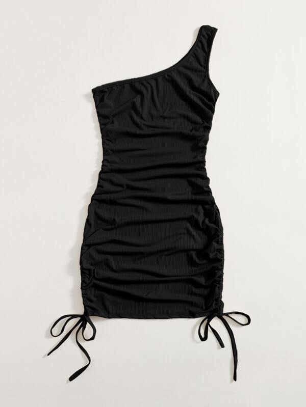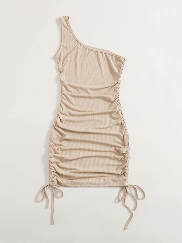 one shoulder drawstring ruched dress