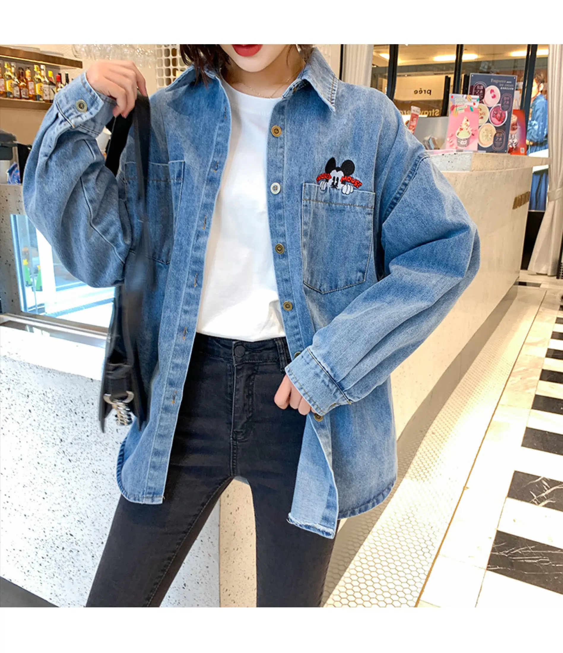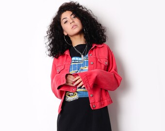 red top with denim jacket
