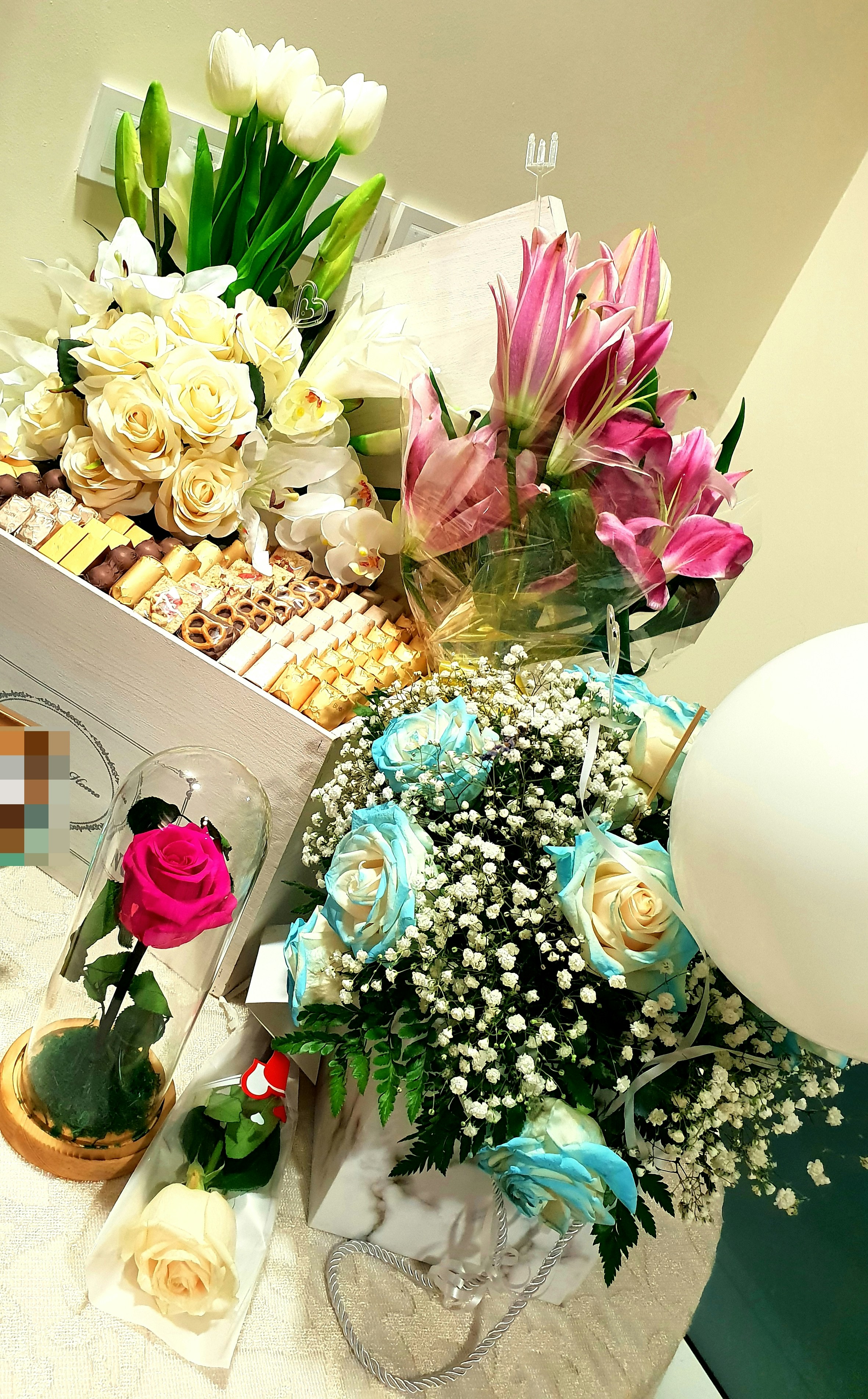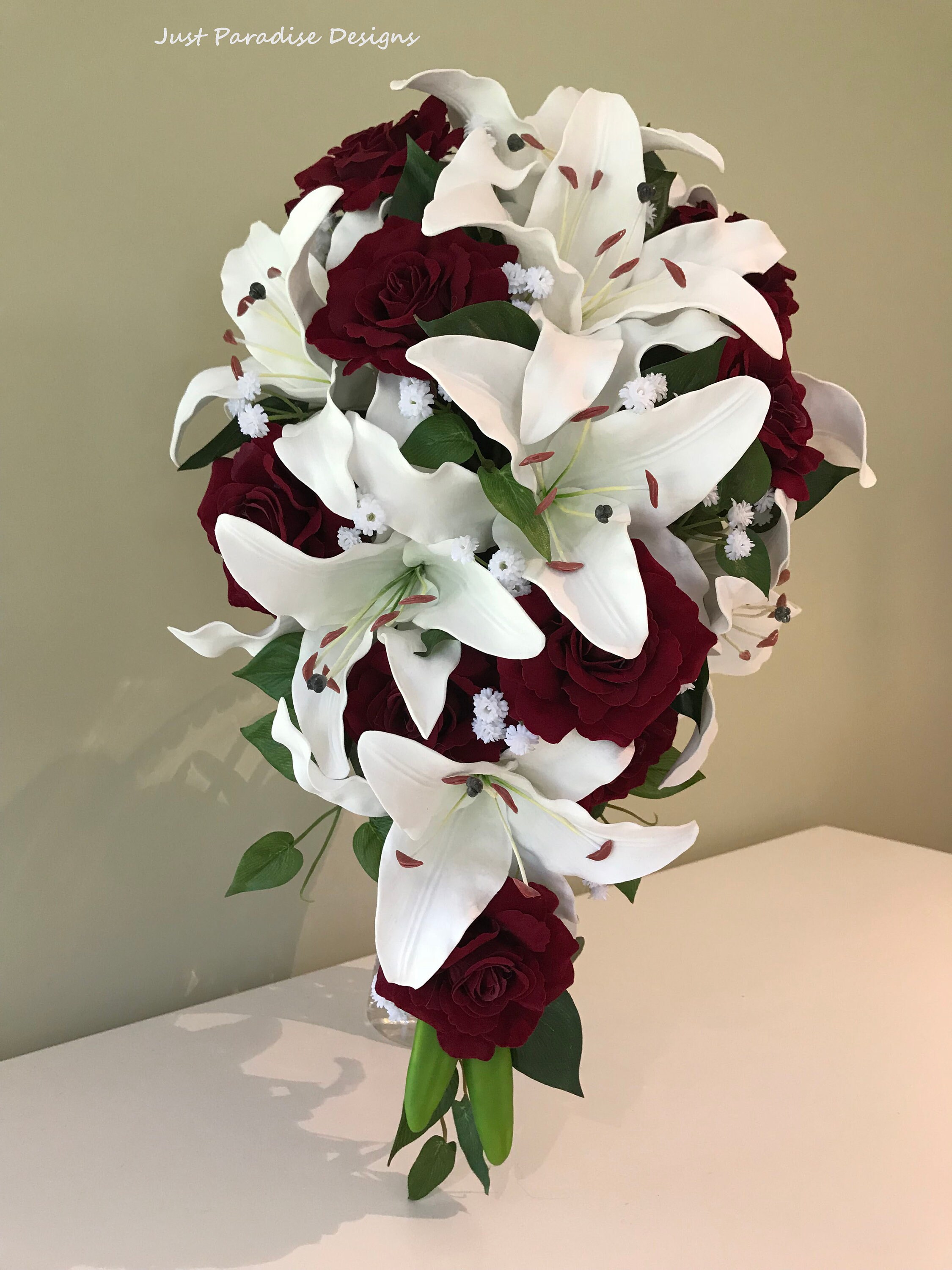 roses lilies and baby's breath bouquet