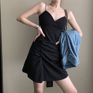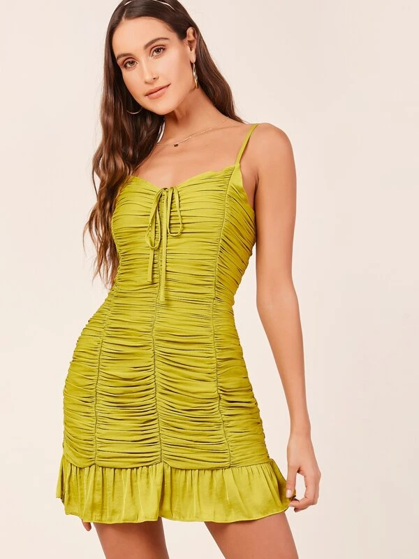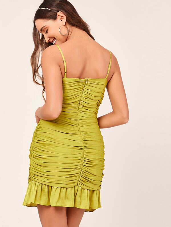 spaghetti strap ruched mini dress