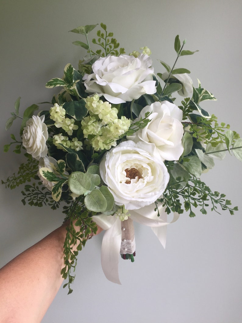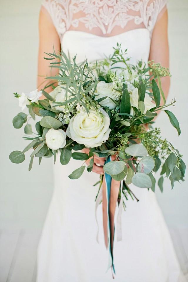 white rose bouquet with greenery