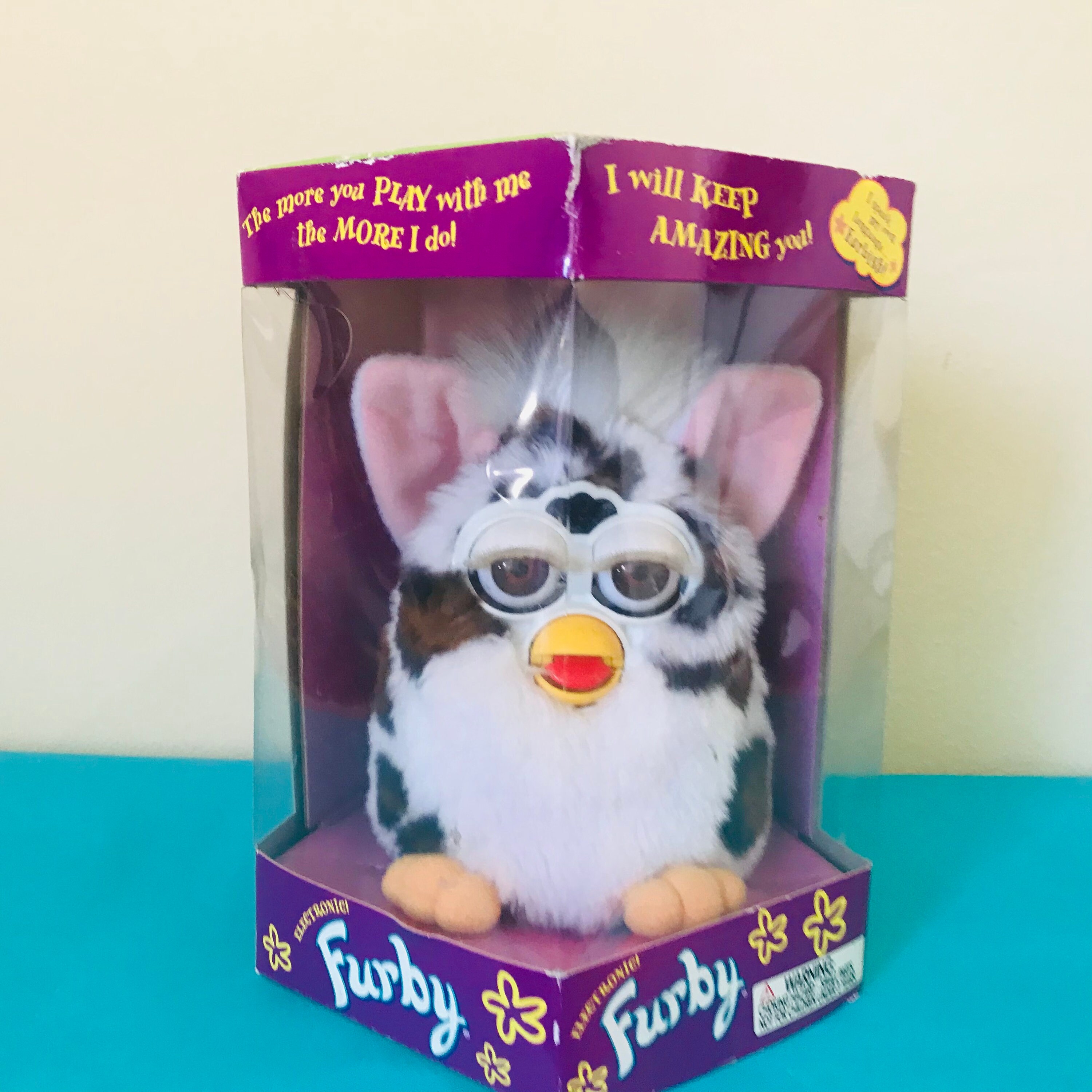 brown and white furby