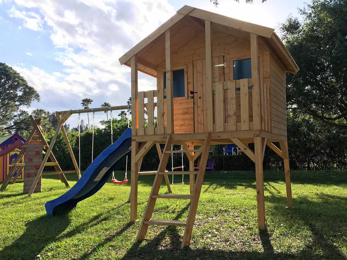 wooden playhouse on stilts with slide